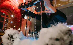 Встречайте Новый год с огненным бармен-шоу! Настоящий маг в блестящем смокинге будет жонглировать шампанским под залпы праздничных хлопушек. Бенгальские огни и ловкие пассы создадут волшебные коктейли с ароматом мандаринов и корицы. Акробатические трюки с шейкерами подарят незабываемое зрелище вашей новогодней ночи, наполненной магией.