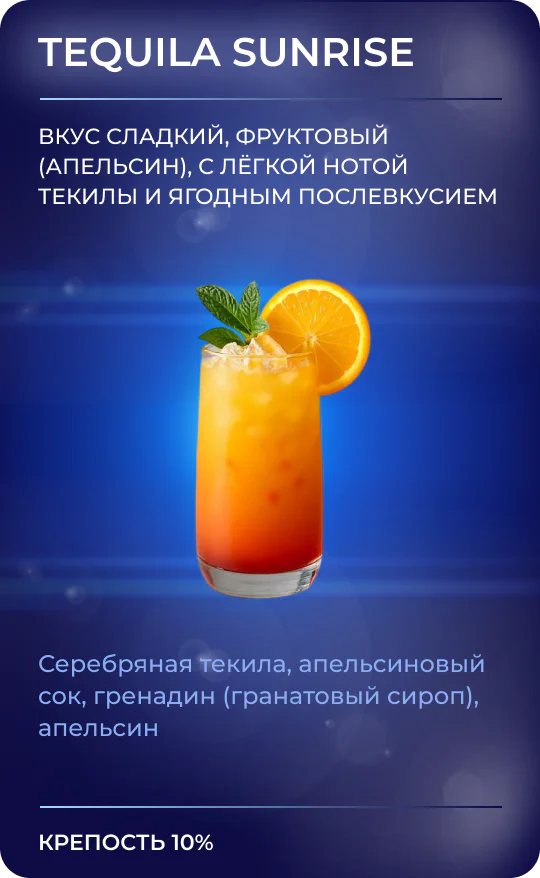 Поклонники Мексики оценят нашу Текила Санрайз и Маргаритую. Ценителям более крепких и аутентичных вкусов придется по душе бередящий Негрони или согревающий Олд Фэшн.